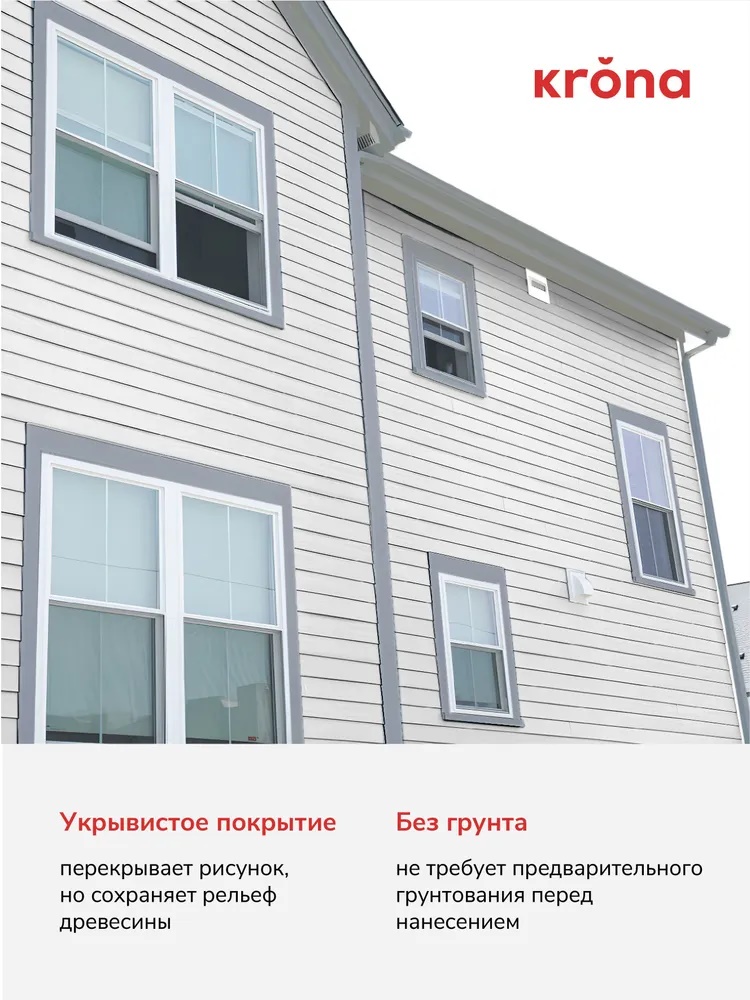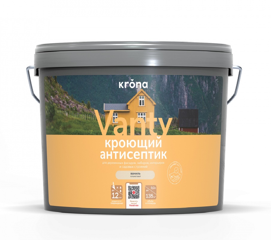 Кроющий антисептик Krona Vanty экологичнен и универсален, подходит для отделки интерьеров и фасадов. Применяется для окраски бруса, вагонки, OSB, фанеры, ДВП, ДСП, МДФ.